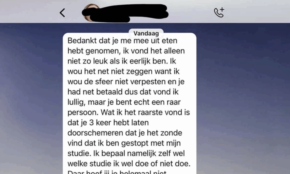 Hoewel natrappen nooit netjes is, kan het soms een manier zijn om irritaties te uiten. De vrouw in het onderstaande gesprek besloot haar frustraties na de date te ventileren. Wat begon als een eenvoudig etentje, eindigde met een felle uitwisseling van woorden via berichten. Ze brandde de man helemaal af, niet bang om haar gevoelens duidelijk te maken.