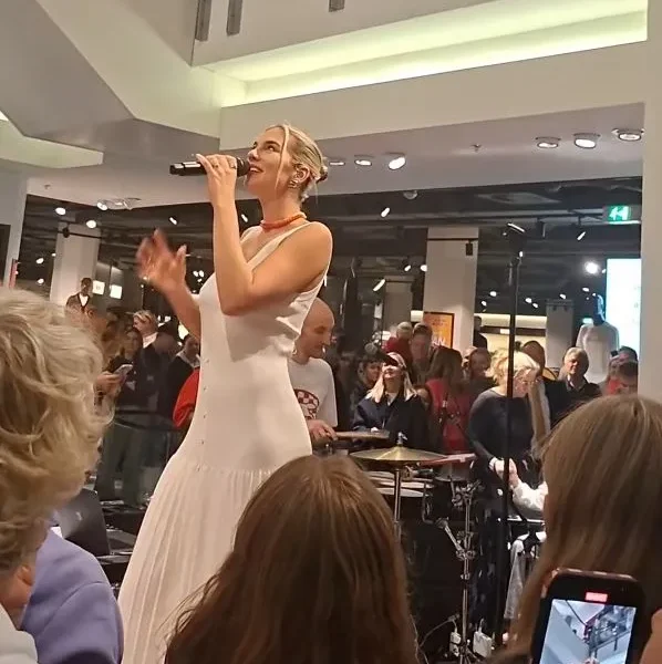 Zangeres Maan doet een optreden bij de Bijenkorf en trekt wat bekijks