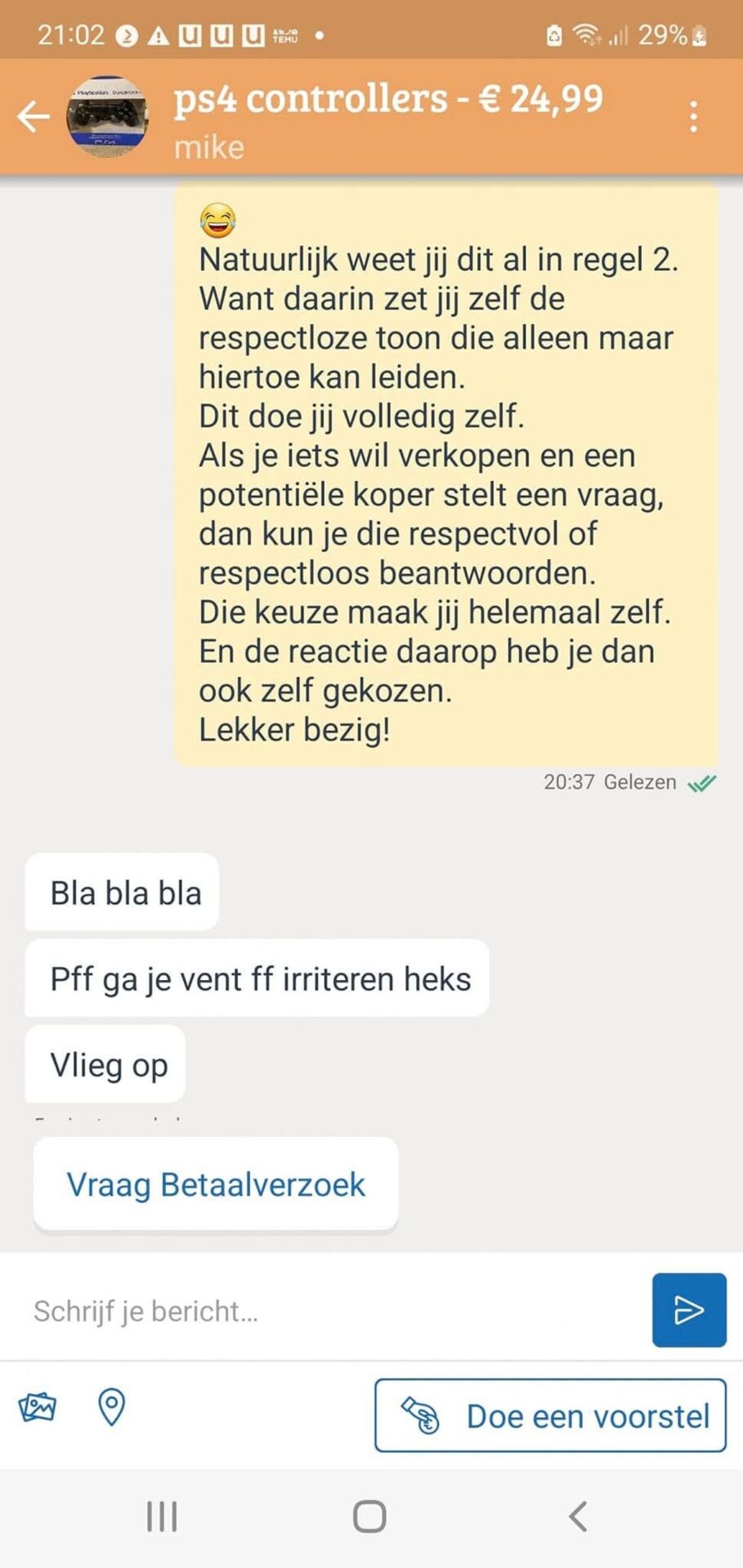 op dat ze met een nogal onbetrouwbare verkoper te maken heeft. Ze
